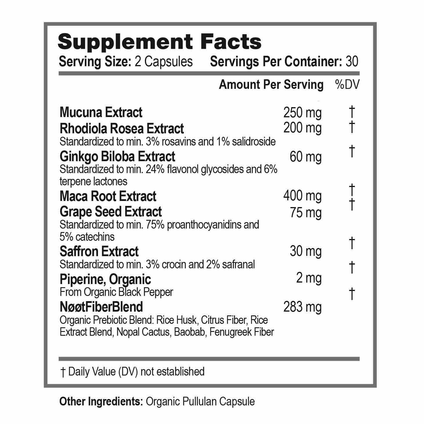 Ginkgo Biloba supports mood and brain & mental circulation, Maca Root supports masculine & feminine performance and balanced hormones.*